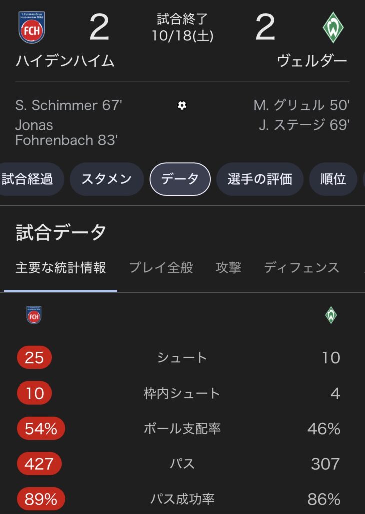 シュート31-11、枠内11-4と数字はHDHが大幅優勢で、結果は妥当なドロー。ブレーメンは守備ブロックとGKの粘りで耐え、攻撃は少数のチャンスを効率良く得点に結びつけた。